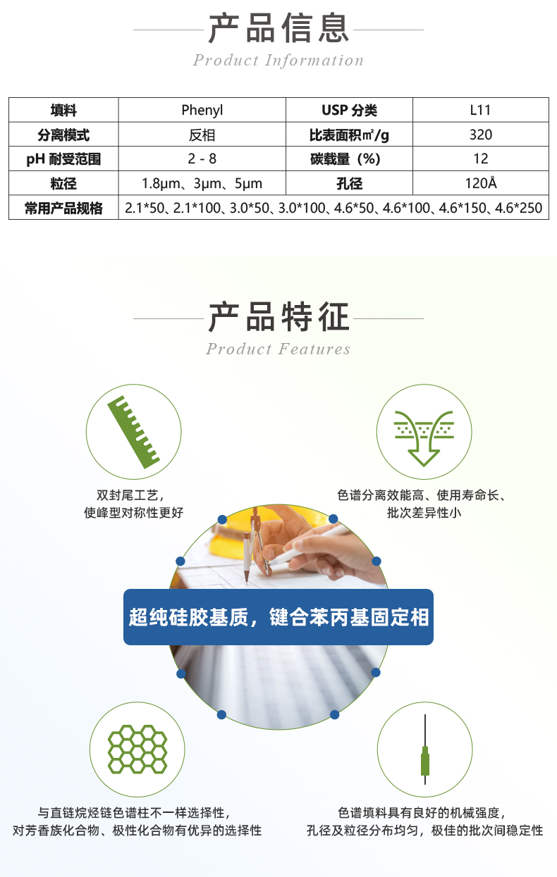 ?●超純硅膠基質(zhì),鍵合苯丙基固定相。